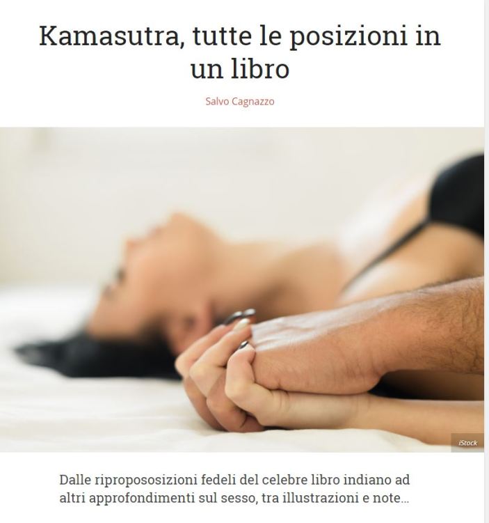 Il Kamasutra, letteralmente “Massime sull’amore”, è un antico testo indiano sul comportamento sessuale umano. Ed è l’opera più importante nella letteratura sanscrita sull’amore. Il libro è stato scritto da Vatsyayana, vissuto in un’epoca fra il I ed il VI secolo. […] Vatsyayana credeva che ci fossero otto modi di fare l’amore, moltiplicati per otto posizioni per ognuno. Ed è proprio questo il capitolo più famoso di quest’opera. Eppure solo circa il 20 per cento del libro è dedicato alle posizioni sessuali. Ma se volete saperne di più, ecco dieci consigli per approfondire l’argomento. (da Salvo Cagnazzo, Consigli.it Cultura “Kanasutra tutte le posizioni in un libro”)