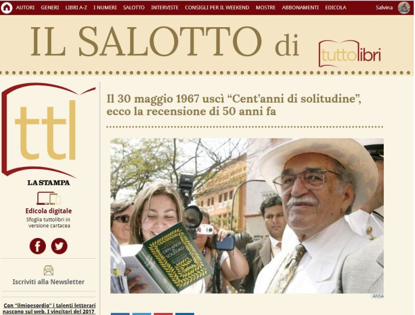 Tuttolibri riporta l’articolo de La Stampa del 29 agosto 1968, comparso nella pagina “Cronache dei libri”, che recensiva con il titolo “La convulsa realtà dell’America latina nel romanzo di uno scrittore colombiano” il romanzo “Cent’anni di solitudine”. Oggi possiamo rileggerlo nella sua pagina originale.