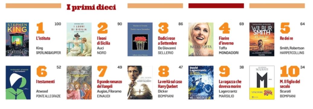 tuttolibri i 10 più venduti, la classifica dal 9 al 15 settembre 2019
