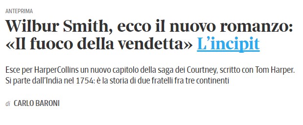 Wilbur Smith “Il fuoco della vendetta” presentazione di Carlo Baroni e l’incipit da Il Corriere Cultura