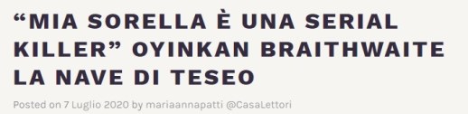 L’autrice è inglese-nigeriana al suo esordio, il romanzo, ora tradotto anche in Italia, è pubblicato da La nave di Teseo. L’ambientazione è a Lagos dove le due sorelle sono partner in crime: l’una colleziona fidanzati mentre l’altra la libera dall’ingombro di quelli “eliminati” e degli eventuali indizi. In questo strano sodalizio tutto sembra procedere senza intoppi fino a quando l’arrivo dell’amore non farà da guastafeste.