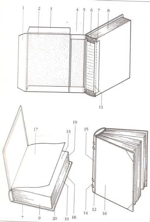 Senza entrare nello specifico*, lo schema sopra riportato servirà egregiamente a illustrare le diverse voci della composizione. I materiali costitutivi erano diversi: storicamente si passa da assi di legno, alla pergamena, al cartone mentre i rivestimenti dei piatti erano in pelle, carta decorata, stoffa.
