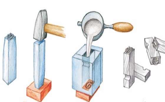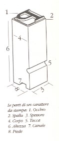 Da sinistra a destra: il punzone, la matrice, la forma, il carattere tipografico