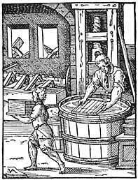 Posta quindi in un tino, nasceva finalmente il foglio immergendovi la cosiddetta “forma”, un’intelaiatura rettangolare con un piano filtrante costituito da sottilissimi fili di ottone detti vergelle, vicinissimi tra loro, paralleli al lato maggiore che incrociano quelli più grossi e distanziati detti filoni. Dopo un’operazione velocissima affidata a esperti il foglio appena formato veniva rovesciato su un feltro e coperto con un altro: aveva inizio la fase dell’asciugatura che si completava stendendo i fogli per un’asciugatura completa. La fase successiva era la collatura, operazione necessaria per rendere la carta impermeabile all’inchiostro.