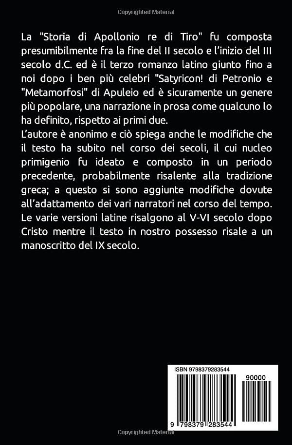 La Storia di Apollonio re di Tiro fu composta presumibilmente fra la fine del II secolo e l’inizio del III secolo d.C. ed è il terzo romanzo latino giunto fino a noi dopo i ben più celebri Satyricon di Petronio e Metamorfosi di Apuleio, sicuramente un genere più popolare, una narrazione in prosa come qualcuno lo ha definito, rispetto ai primi due (dalla Premessa)