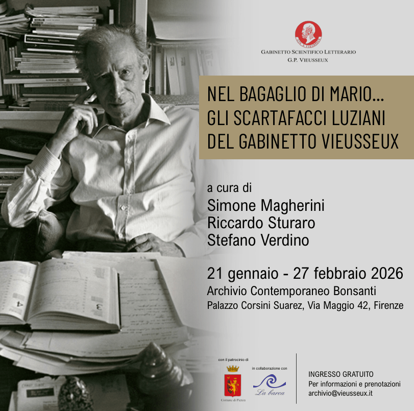 La Mostra  dal titolo “Nel bagaglio di Mario… Gli scartafacci luziani del Gabinetto Vieusseux”, a Palazzo Corsini Suarez, curata da Simone Magherini, professore di Letteratura italiana all’università di Firenze, Riccardo Sturaro e Stefano Verdino, professore di Letteratura italiana all’università di Genova.
