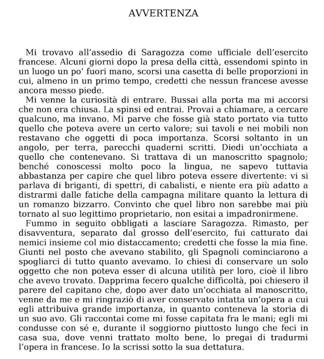 è l’opera più conosciuta di Potocki, etnologo e slavista nonché autore di libri di viaggio, come quello presentato su tuttatoscanalibri e relativo alla cronaca del viaggio in Marocco, e non solo per l’incredibile storia di pubblicazioni parziali, testi smarriti, plagi e traduzioni che l’accompagnano, ma soprattutto per il suo valore letterario.