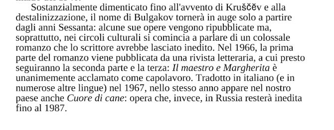 Nell’ora di un caldo tramonto primaverile apparvero presso gli stagni Patriaršie due persone. Il primo – sulla quarantina con un completo grigio estivo – era di bassa statura, scuro di carnagione, ben nutrito, calvo; teneva in mano una dignitosa lobbietta, e il suo volto, rasato con cura, era adorno di un paio di occhiali smisurati con una montatura nera di corno. Il secondo – un giovanotto dalle spalle larghe, coi capelli rossicci arruffati e un berretto a quadri buttato sulla nuca – indossava una camicia scozzese, pantaloni bianchi spiegazzati e un paio di mocassini neri. Il primo altri non era che Michail Aleksandroviè Berlioz, direttore di una rivista letteraria e presidente di una delle piú importanti associazioni letterarie moscovite, denominata per brevità MASSOLIT ; il suo giovane accompagnatore era il poeta Ivan Nikolaevič Ponyrëv, che scriveva sotto lo pseudonimo Bezdomnyj .Giunti all’ombra dei tigli che cominciavano allora a verdeggiare, gli scrittori si precipitarono per prima cosa verso un chiosco dipinto a colori vivaci, che portava la scritta «Birra e bibite». Ma conviene rilevare la prima stranezza di quella spaventosa serata di maggio. Non solo presso il chiosco, ma in tutto il viale, parallelo alla via Malaja Bronnaja, non c’era anima viva. In un’ora in cui sembrava mancasse la forza di respirare, quando il sole che aveva arroventato Mosca sprofondava oltre la circonvallazione Sadovoe in una secca bruma, nessuno era venuto sotto l’ombra dei tigli, nessuno sedeva sulle panchine, deserto era il viale.